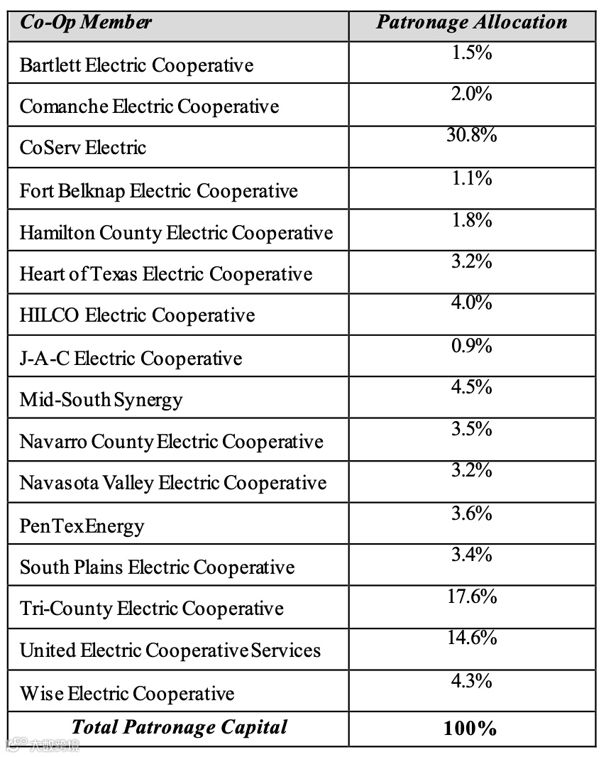 布拉索斯电力不赚取“利润profit”,而是将其营业支出以外的任何收入称为“保证金margin”,其中一部分“保证金margin”作为"Patronage Allocation" (赞助金)分配给16个会员分销商,"Patronage Allocation" (赞助金)每年根据当年的各自购买的电量做分配一次。