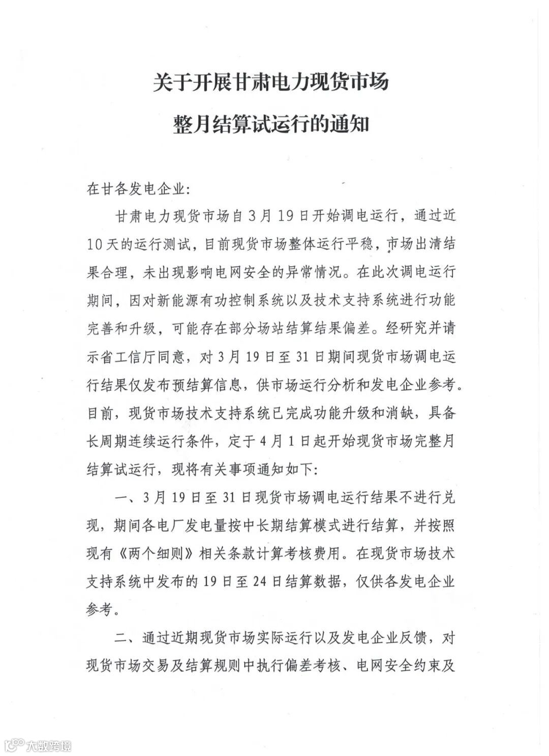 导读:近日,甘肃电力调度中心发布《关于开展甘肃电力现货市场整月结算试运行的通知》。