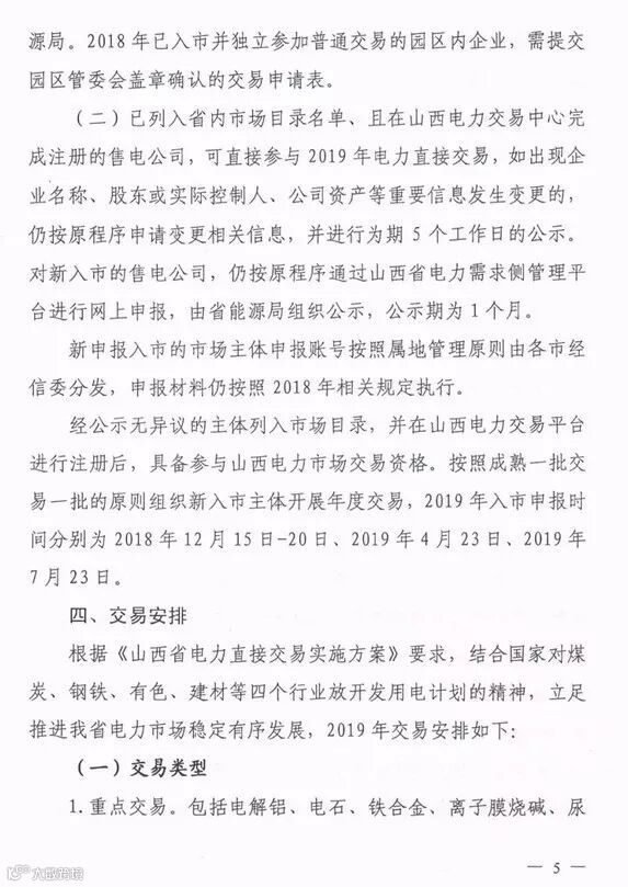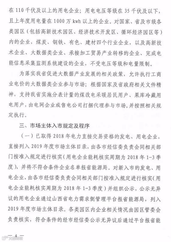 《方案》表示,山西2019年的电力交易,将进一步放宽大工业用电企业参与市场的范围:用电电压等级在110千伏及以上的用电企业;用电电压等级在35千伏以上及以下,且上年度用电量在1000万kwh以上的企业,对国家、省及市级各类园区(包括高新技术园区、经济技术开发区、循环经济园区等)内的企业,煤炭、钢铁、有色、建材四个行业企业,以及高新技术企业、大数据企业、承接加工贸易产业转移的企业、完成电能信息采集监测系统建设的企业,不受电压等级和电量限制。