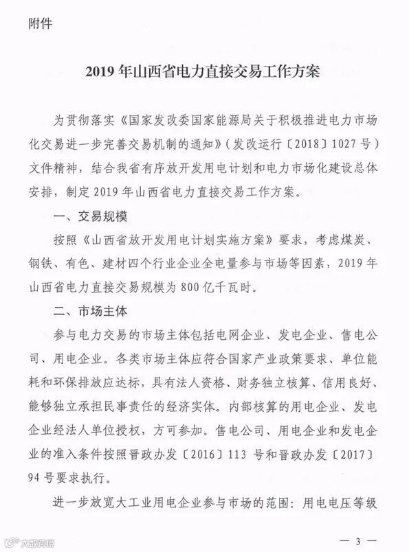 近日,山西省能源局发布了《2019年山西省电力直接交易工作方案》(以下简称《方案》)。《方案》提出,2019年山西省电力直接交易规模为800亿千万时,参与交易的市场主体,入市申报时间分别为2018年12月15日—20日、2019年4月23日、2019年7月23日。