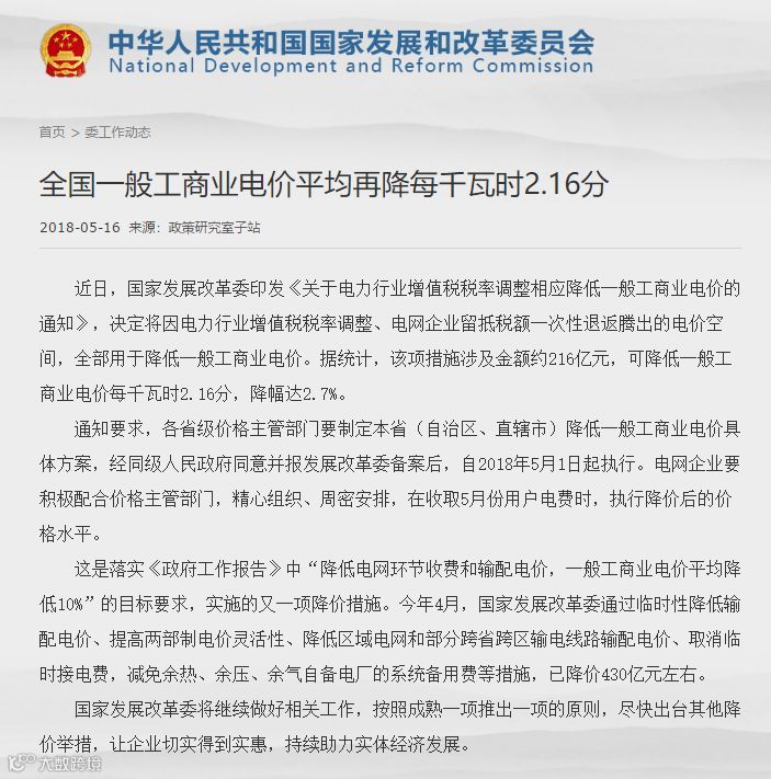 今天(5月16日),国家发改委发布《全国一般工商业电价平均再降每千瓦时2.16分》。因电力行业增值税税率调整、电网企业留抵税额一次性退返腾出的电价空间,全部用于降低一般工商业电价。而据统计,该项措施涉及金额约216亿元,可降低一般工商业电价每千瓦时2.16分,降幅达2.7%。
