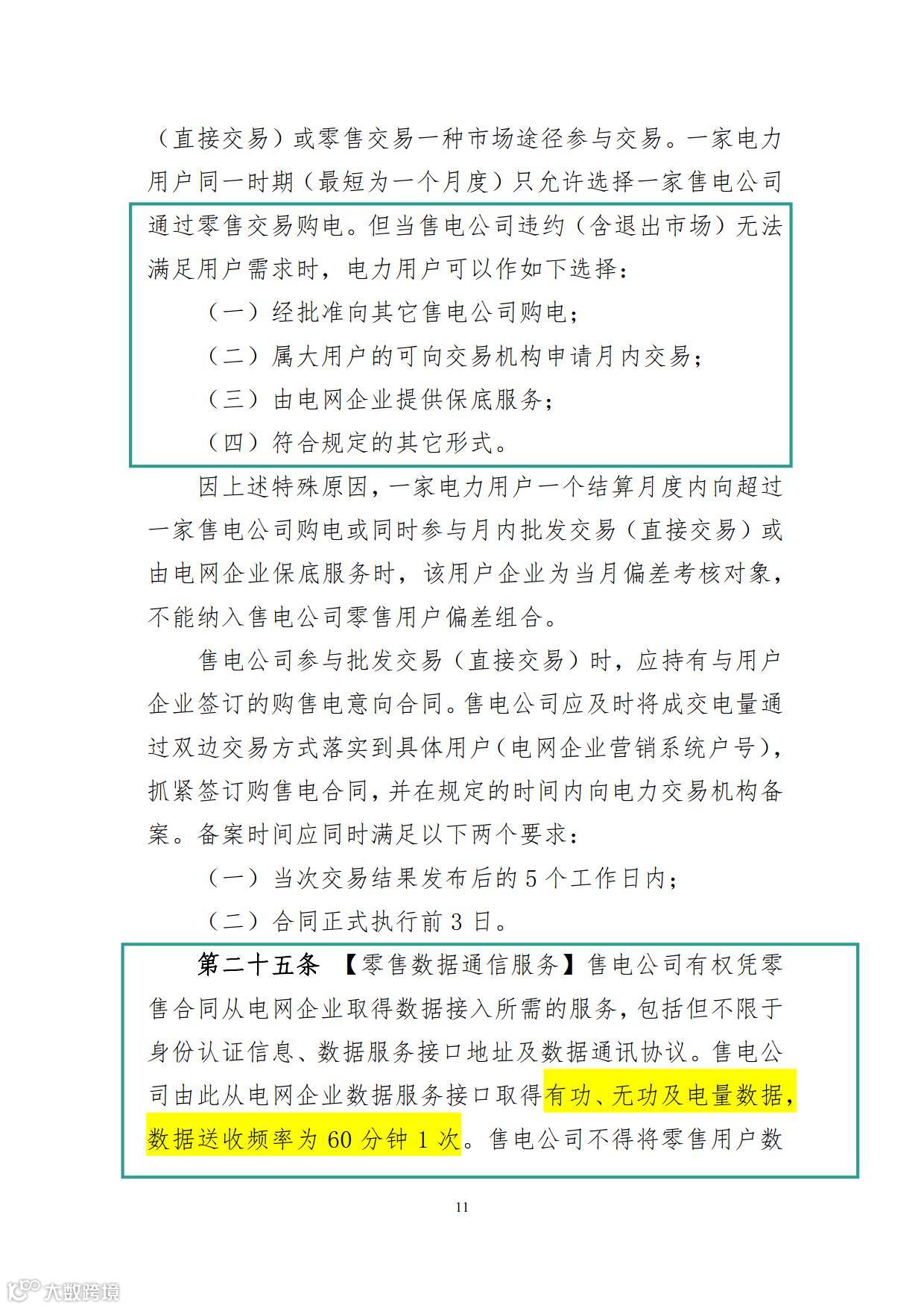 售电公司有权凭零售合同从电网企业取得数据接入所需的服务,有功、无功及电量数据,数据送收频率为60分钟1次。(第二十五条)