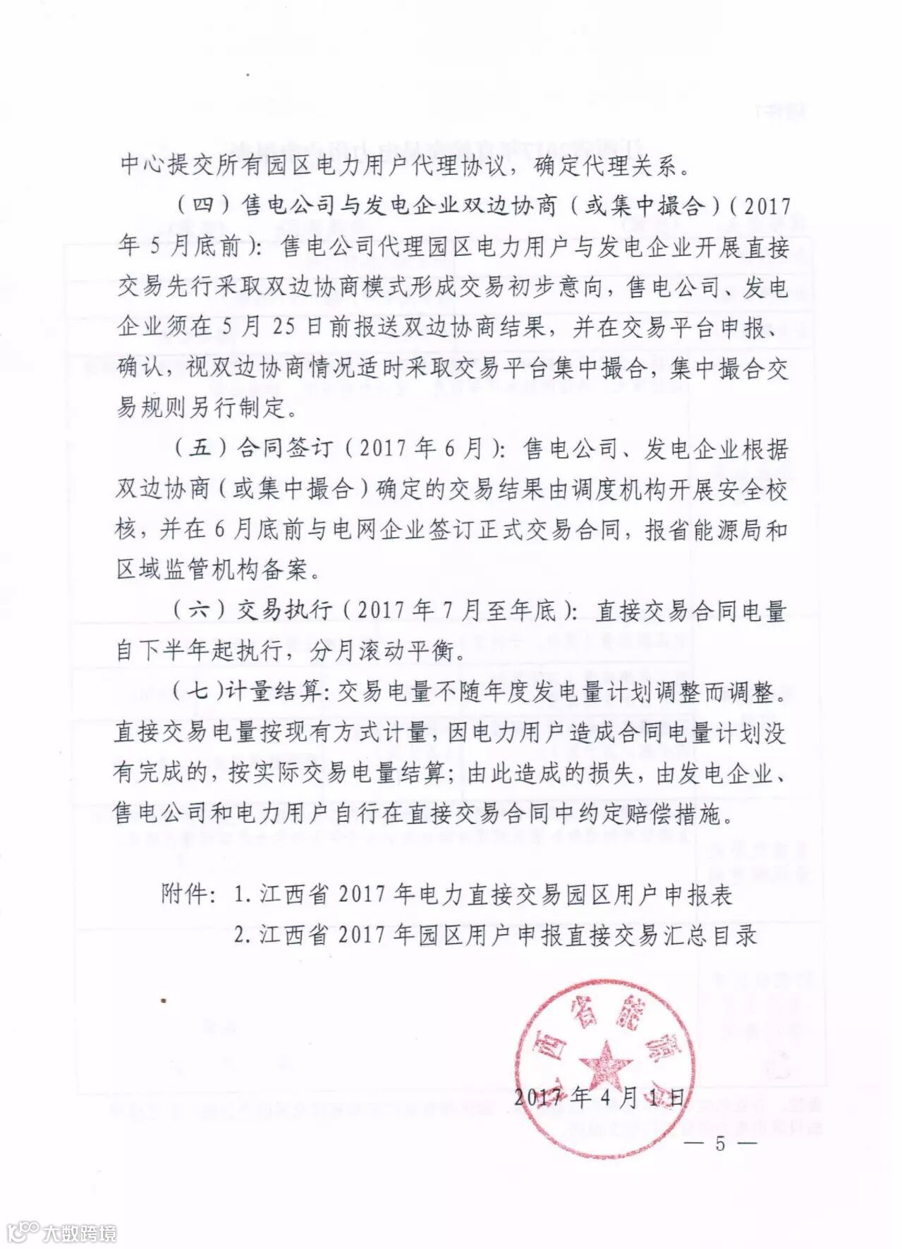 根据江西在2016年12月9日发布的《关于印发2017年电力用户与发电企业直接交易实施方案的通知》中可知,江西今年安排的市场交易电量规模为150亿千瓦时(含园区交易电量),而在4月1日发布的通知中,园区交易电量交易规模暂定为50亿千瓦时,这次交易所签订的电能合同执行时间段是下半年,也即是从2017年7月至年底,分月滚动平衡。