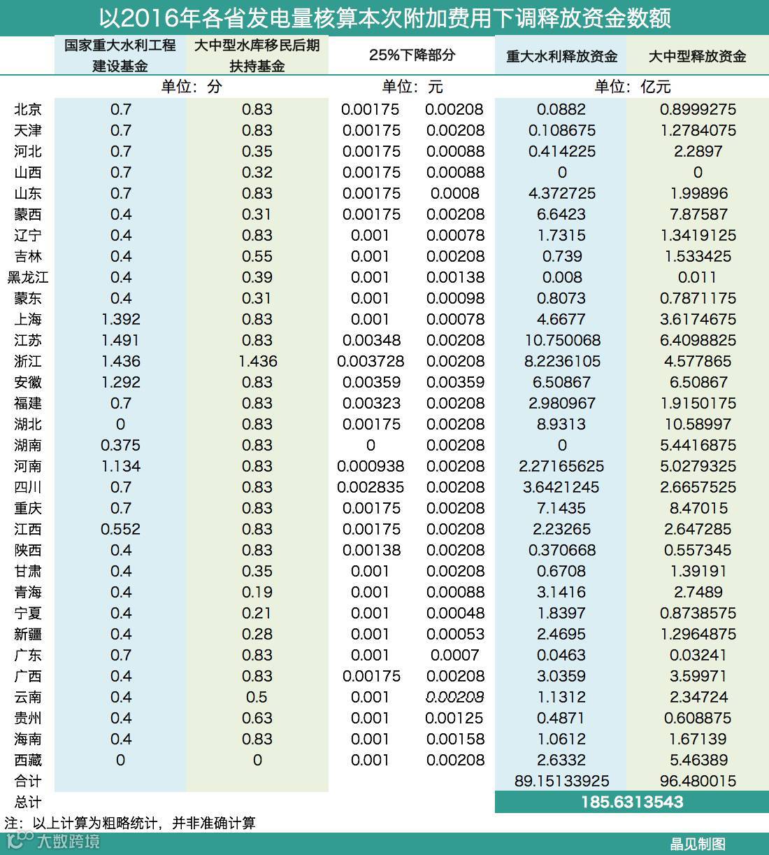 同时,根据各省开征的重大水利工程建设基金和大中型水库移民后期扶持基金,晶见也以2016年各省发电量进行了匹配统计,这其中释放的资金潜力约为185.63亿元。(详细见下图)