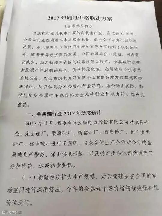 今天(6月7日),云南省保山市发改委发布了一份关于《2017年硅电价格联动方案》的通知。硅电价格联动?晶见小伙伴看到这个词的时候一脸懵逼。看完文件才搞懂这个硅电价格联动的目的。