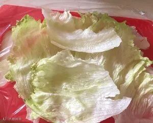 1.生菜,取几片大一点的,平整的铺在保鲜膜上。一会可以直接卷起来。