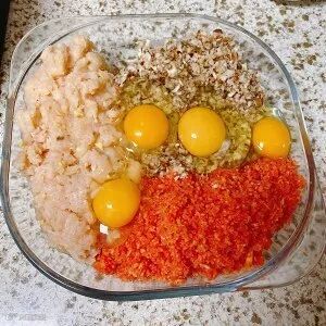 1.将鸡胸肉、胡萝卜、香菇分别切小块后放入绞肉机打碎。不要打太碎,打成酱酱就不好吃了。