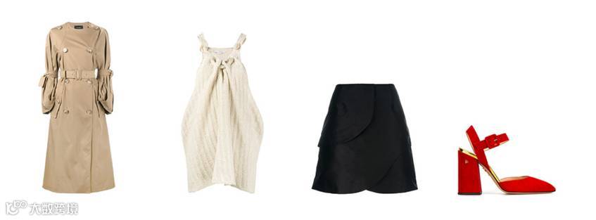 左起:SIMONE ROCHA 双排扣风衣,STELLA MCCARTNEY 勾编无袖上衣,ISA ARFEN 蝼线迷你半身裙,CHARLOTTE OLYMPIAAmelie 高跟鞋 (以上产品均可购于Farfetch.com)