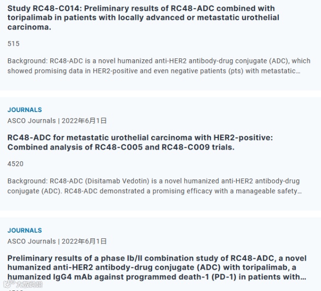 本次ASCO,荣昌生物RC48相关三个报告入选将公布RC48联合toripalimab(特瑞普利单抗)治疗局部晚期或转移性尿路上皮癌患者的1b/2期最新研究结果;RC48联合放疗、PD-1/PD-L1抑制剂、GM-CSF和序贯IL-2(PRaG3.0方案)治疗HER2表达的晚期实体瘤患者2期最新研究结果;以及评估RC48用于乳腺外佩吉特病患者的意义。另外,荣昌生物一项关于抗体药物偶联物治疗高危非肌层浸润性膀胱癌的疗效和安全性的研究成果也入选了ASCO。同时也一定程度反映了国内ADC的第一梯队企业具有强劲的、持续的研发潜力。