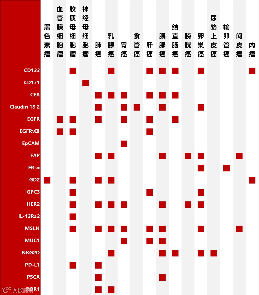 胶质母细胞瘤(GBM):相关热门靶点包括CD133、EGFR、EGFRvIII、GD2、GPC3、HER2、IL-13Rα2、MSLN/Mesothelin、PD-L1。