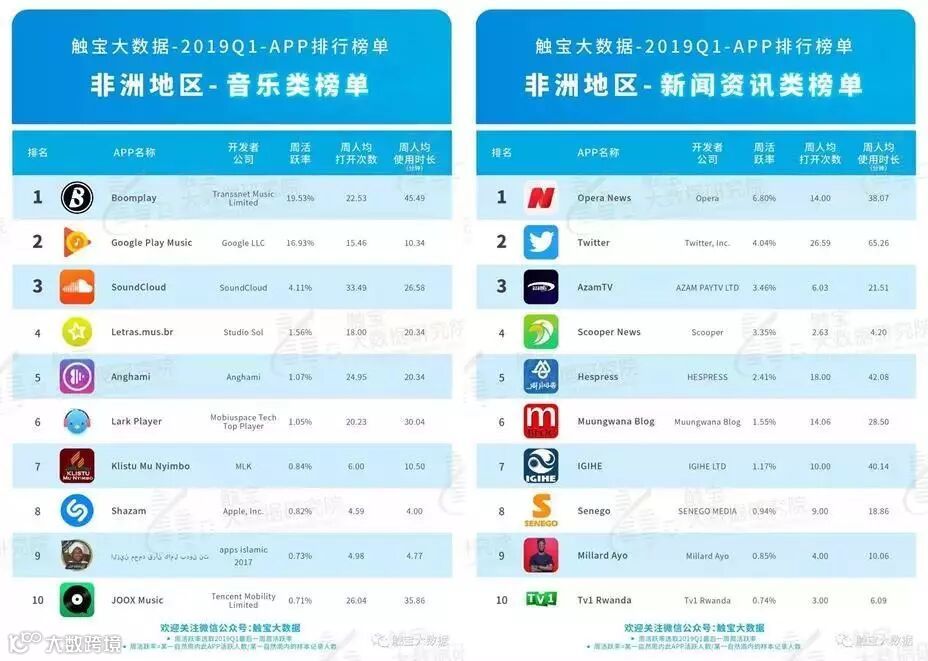 根据“触宝大数据-2019Q1-APP排行榜单”的非洲地区音乐类榜单,Boomplay传易音乐排第一。Boomplay其实做的更多的是本地化内容,而不是欧美的内容,很快的就超过了Google Play Music,位居第一。排名第五的Anghami是阿拉伯文化圈的一个流媒体音乐平台,因为北非其实有很多阿拉伯人,所以它在非洲的APP排名也上升很快。要想脱颖而出快速增长,需要挖掘更多本地化的与欧美文化惯性不一样的内容。