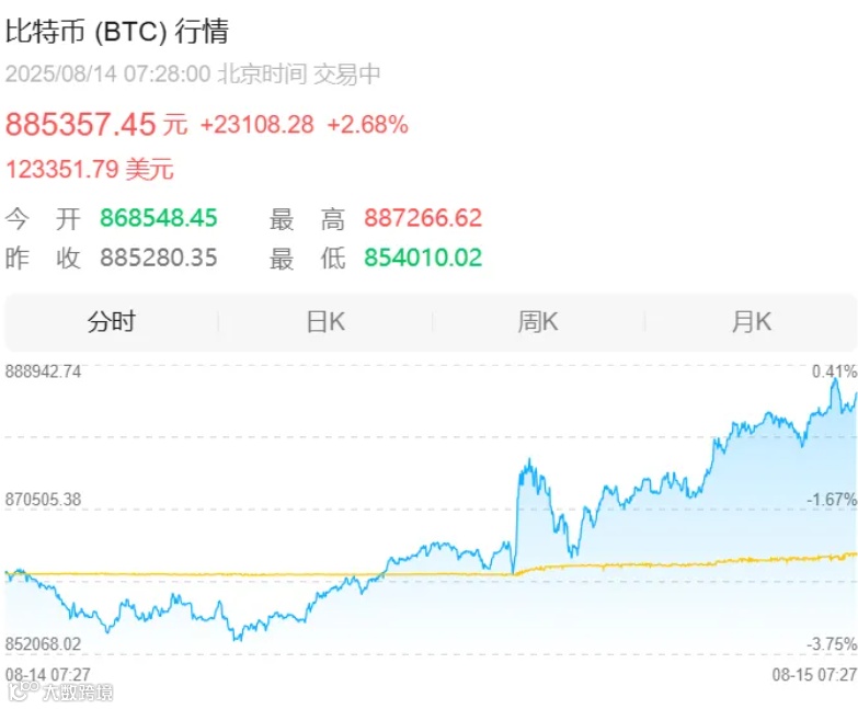 据财联社8月14日报道,比特币突破123500美元,创历史新高,日内涨超2%。