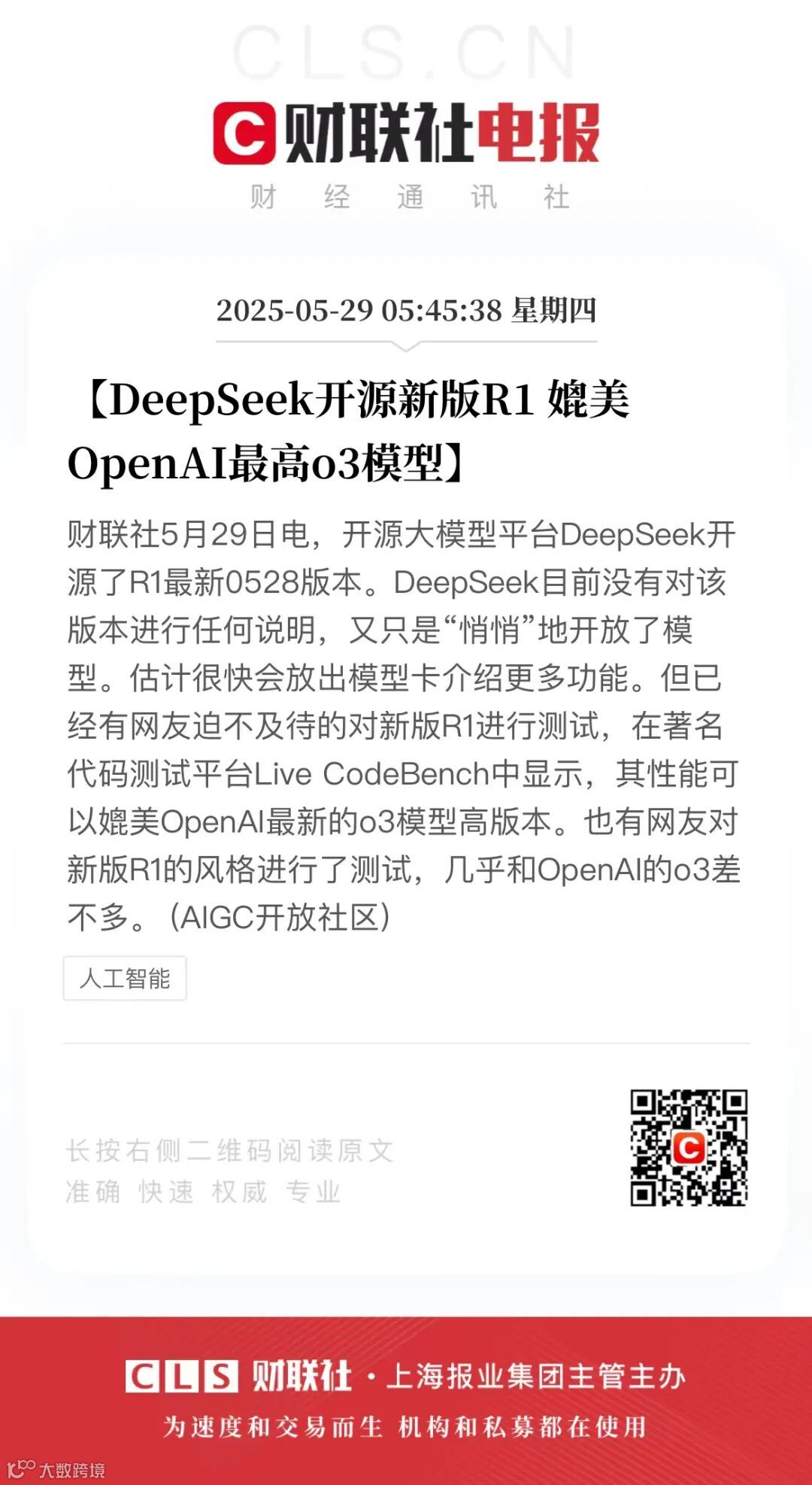 估计很快会放出模型卡介绍更多功能。但已经有网友迫不及待的对新版R1进行测试,在著名代码测试平台Live CodeBench中显示,其性能可以媲美OpenAI最新的o3模型高版本。也有网友对新版R1的风格进行了测试,几乎和OpenAI的o3差不多。 (AIGC开放社区)