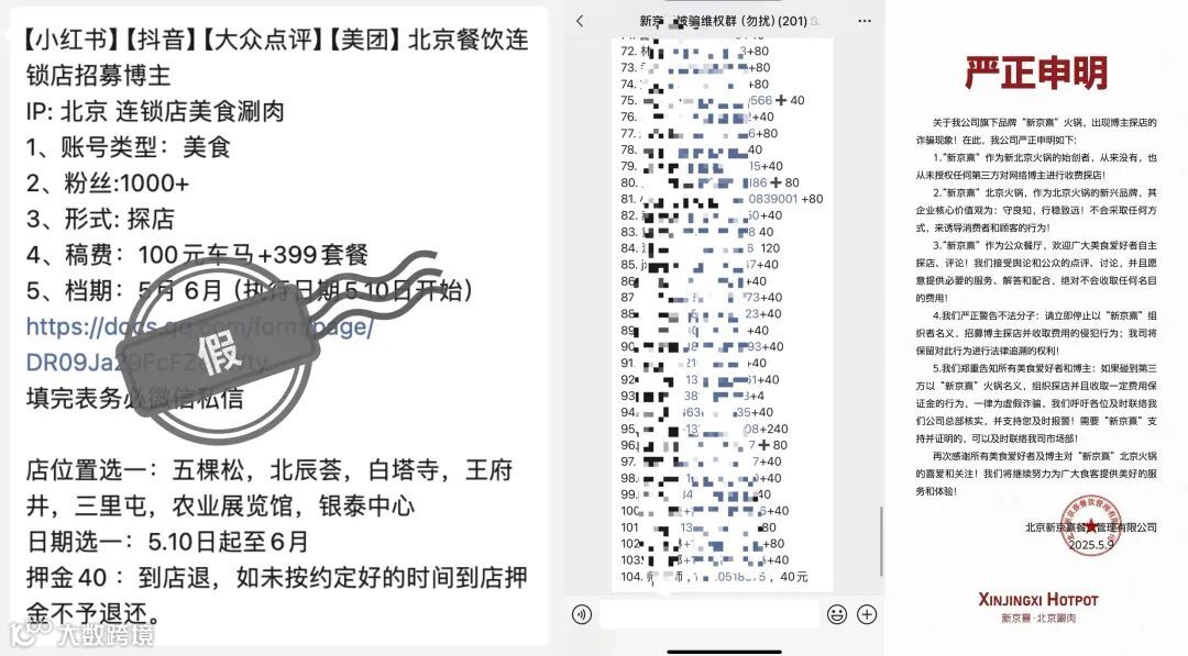Ann是遭遇该探店骗局的探店博主之一。她回忆称,当时在很多群都看到了这则探店通告,有骗子打着北京知名火锅店新京熹的旗号邀约千粉博主探店,承诺免费双人餐和百元左右稿费。