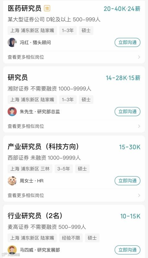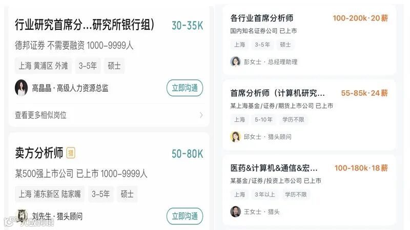 从各家券商目前的招聘信息来看,根据券商的规模和分析师职级的不同,薪资差距也较为明显,若从中小型券商跳至头部券商,从普通分析师成长为首席,那么薪资也会有较为可观的跃升。