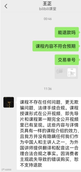 前述消费者杨先生透露,事发一两天的时候学院派还是同意退款的,现在舆情闹大了就不给退了。在杨先生提供的截图中,学院派主创之一王正回应称:课程不存在任何问题,更无欺骗。课程授课形式在公开视频、即先导片和课程第一期完全公开视频里已有呈现……因消费者主观疏失导致的错误购买,恕不支持退款。