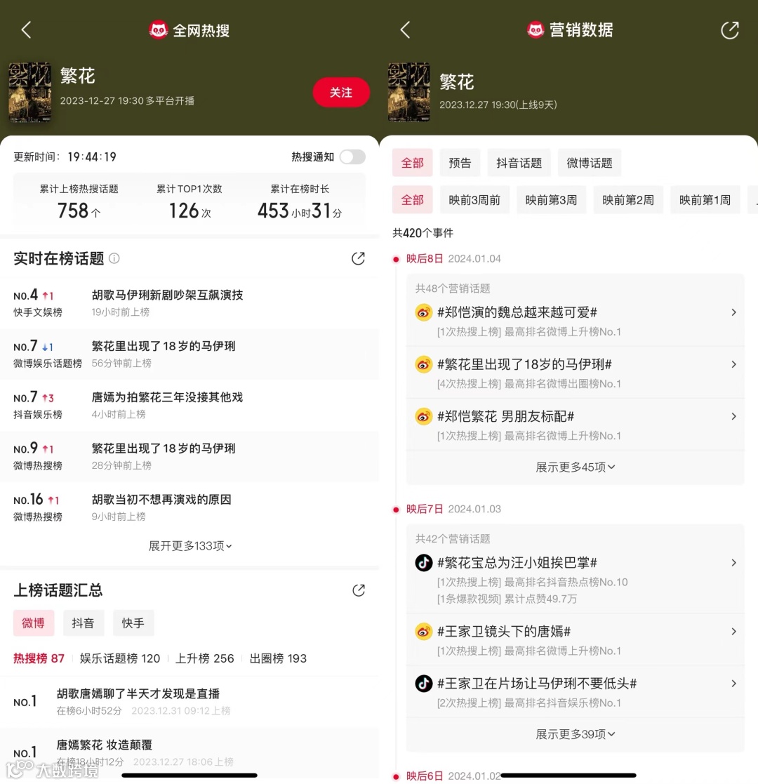 猫眼数据显示,截至今日(剧集上线9天),《繁花》共有420个营销事件,其中包括758条热搜,累计在榜时间453小时有余。可以用来对比的是,同平台播出的古偶剧《神隐》上线25天,目前共有644个营销事件,播得还不错的《我知道我爱你》仅有94个营销事件。