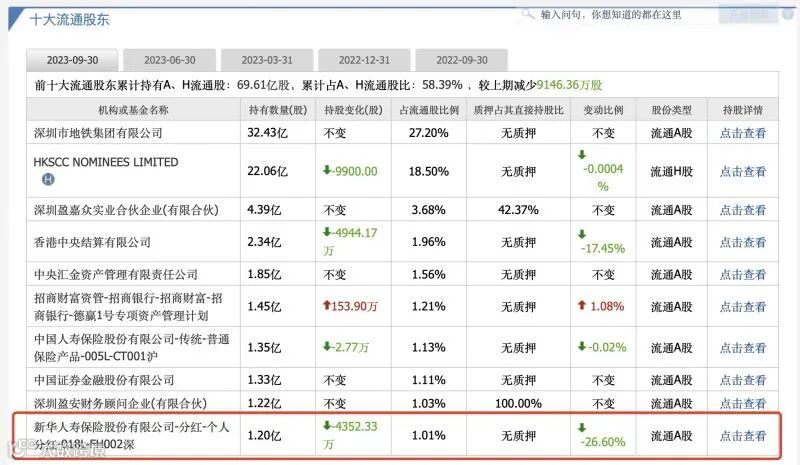 据同花顺,截至2023年9月30日,在万科A前十大流通股东之中,“新华人寿保险股份有限公司-分红-个人分红-018L-FH002深”列第十位,持股1.2亿股,占流通股比例1.01%。