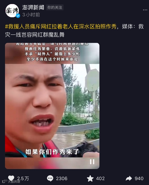 据该博主所描述,救援现场两个人拉着个老头站在水中间摆拍作秀,另一人负责拍照,此举遭到众人怒斥后才离开。