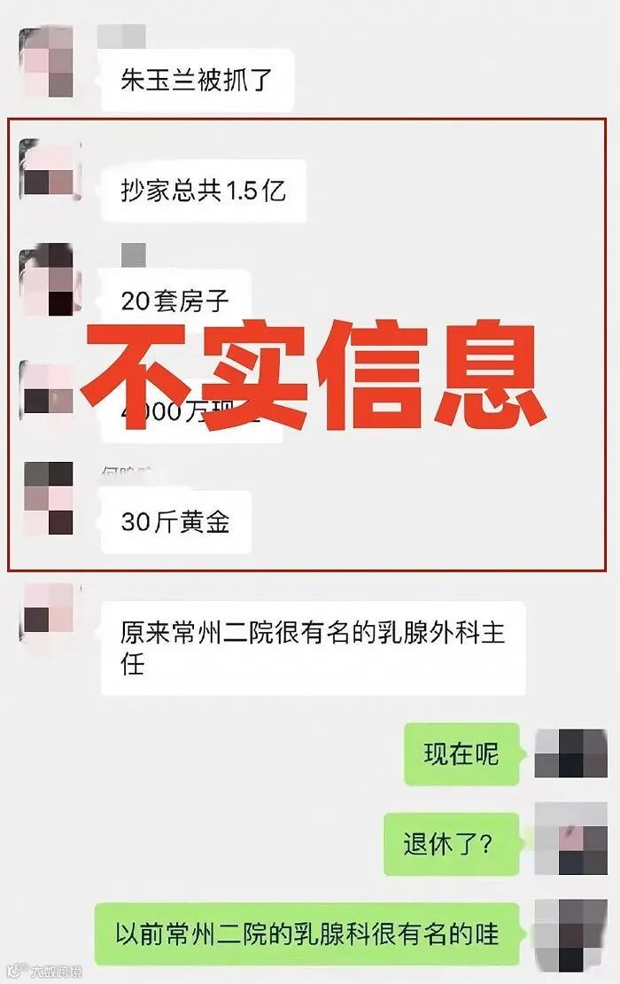 市著名乳腺外科专家朱某某被抓,家里共查出1.5亿包括4000万现金、20套房子、30斤黄金。8月10日,常州广播电视台微信公众号“中吴网”辟谣称,此为不实信息。