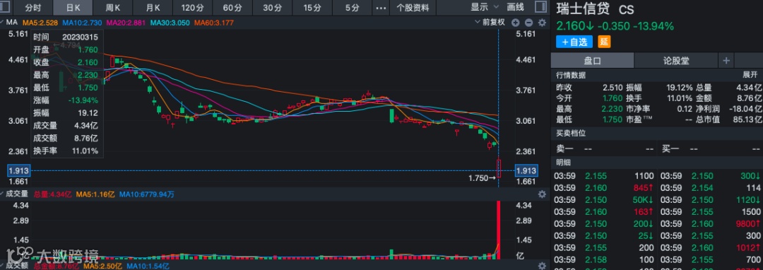与此同时,美国银行也延续了下跌的势头,第一共和银行收跌20.57%,摩根大通、富国银行、美国银行、花旗集团分别下跌4.72%、3.29%、0.94%、5.44%。此次欧美银行股集体暴跌的导火索为瑞士信贷,消息面上,中东大股东已明确表态不会再投资。沙特国家银行董事长Ammar Al Khudairy向外媒表示,由于监管限制,其无法为瑞士信贷提供更多资金。“因为我们的持股会超过10%,这是一个监管问题。”他补充称,瑞士央行对瑞士信贷的转型计划感到满意,并暗示该行不太可能需要额外资金。去年10月,沙特国家银行以14亿瑞郎的价格收购了瑞信9.9%的股份,这也是瑞信当时42亿美元融资的一部分,目的是为改善其投行业务的业绩、解决一系列风险和合规问题的大规模战略改革提供资金。然而,沙特国家银行这笔14亿瑞郎的投资,在入股后的短短几个月就蒸发了5亿瑞郎。存款流失、财务缺陷、评级下调瑞士信贷危机四伏值得注意的是,瑞士信贷所面临的危机还远远不止于此。危机一:重大财务缺陷当地时间3月14日,瑞士信贷官网发布年度报告,称在2022财年和2021财年的报告程序中发现“重大缺陷”,事关未能在财务报表中设计和维持有效的风险评估,并正在采取补救措施。年报显示,2022年全年瑞士信贷报告的税前损失为32.58亿瑞士法郎,归属于股东的净亏损为72.93亿瑞士法郎。