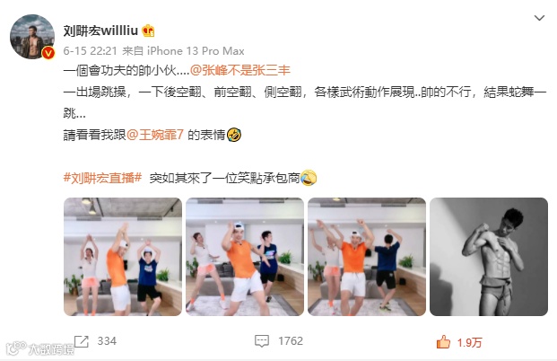 值得一提的是,新主播张峰也参与了这次户外直播。更早之前的6月,他就多次出现在刘畊宏的直播和短视频中。刘畊宏甚至发了微博介绍这位会跳操、会功夫的小伙。