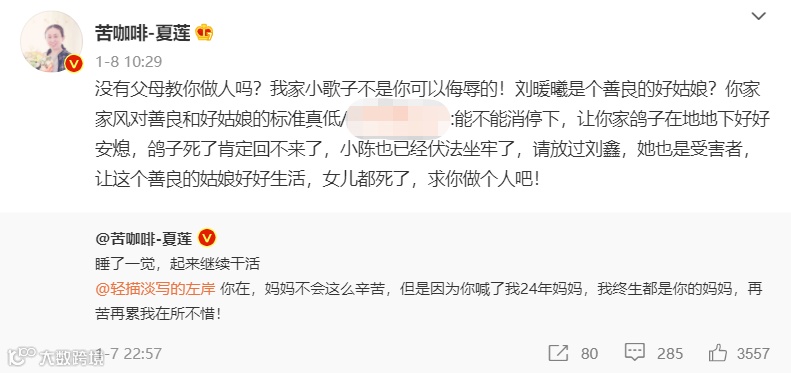 相比改名后又被封号匿迹的刘鑫,江秋莲在舆论场上似乎显得要更高调一些。江歌离世后,她活着的每一天,“都是为歌儿(江歌)讨还一个公道而努力”。在这五年间,江秋莲持续面临着劝解、辱骂和诽谤。