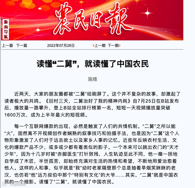 对此,今日农民日报刊文谈二舅走红,文章表示,“二舅”的故事终会淡去,明天还会有新的爆款、新的热点。我们很庆幸,在这个注意力时代,有一位农民的故事能被这么多人看到,并激起共鸣。我们更期待,这种关注度能转化为对农民福祉和制度保障的更持久观照。在全面推进乡村振兴的新征程上,把我们的情怀与思考,都能聚合成更加可为善为的力量,真正帮助农民摆脱艰难、摆脱不易,让我们的乡土社会不再有“二舅”这样的苦和难。
