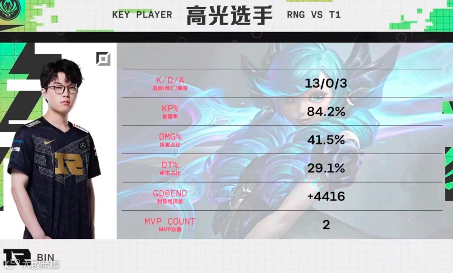然而事实上,T1并没有像外界预测的那样呈现出压倒性的优势,反之本次比赛中,RNG打得极为强势,入侵野区拿下一血;团战四打五打得T1毫无还手之力;阿bin天神下凡“13-0”,展现出极强的个人能力……