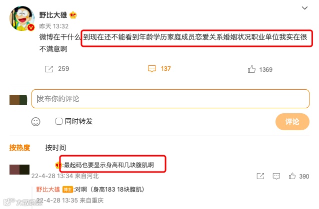 从昨日至今,围绕“显示IP地址”的讨论一直没有停过。有人戏称,微博的solgan可以改为“随时随地,发现老乡”,此举大大利好同城交友。也有人调侃,微博何时上线年龄学历职业单位,横竖也得体现出“身高183腹肌18块”。