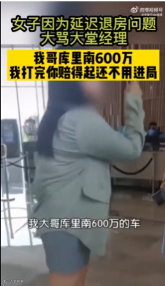 女子因延迟退房问题大骂大堂经理:“我哥库里南600万”