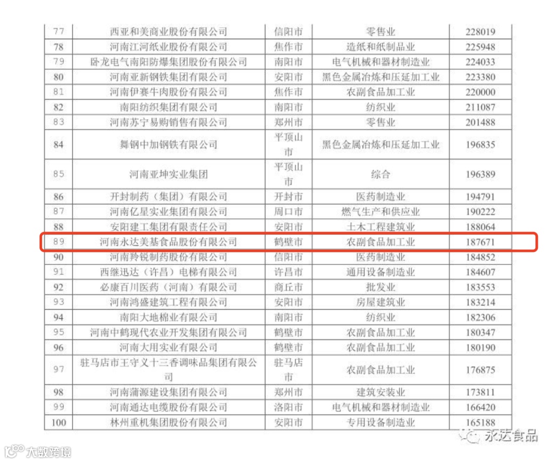 在2018河南民营企业100强榜单上,河南永达美基食品股份有限公司以18.7671亿元营业收入总额位居河南民营企业100强第89位。