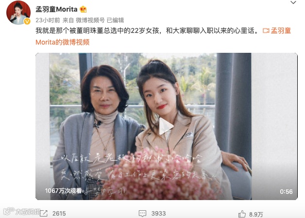 11月11日下午,孟羽童在个人微博晒出视频并配文:“我就是那个被董总选中的22岁女孩,和大家聊聊入职以来的心里话。” 她表示,自己只是非常幸运遇到了很好的老板和平台,“我真的就是一个很普通的女孩和一个打工人,我也知道自己有很多的缺点和不足,所以非常感谢大家愿意给我提出中肯的建议或者是意见。”