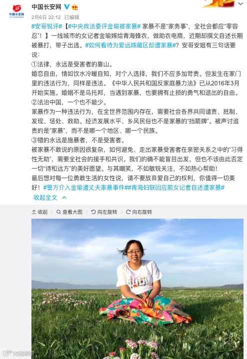 中央政法委通过官方微博@中国长安网 发文称,家暴不是“家务事”,全社会都应“零容忍”。一线城市的女记者金瑜嫁给青海蜂农,做助农电商,近期却撰文自述长期被暴打,带子出逃。如何看待为爱远嫁藏区却遭家暴?中央政法委有三句话要说: