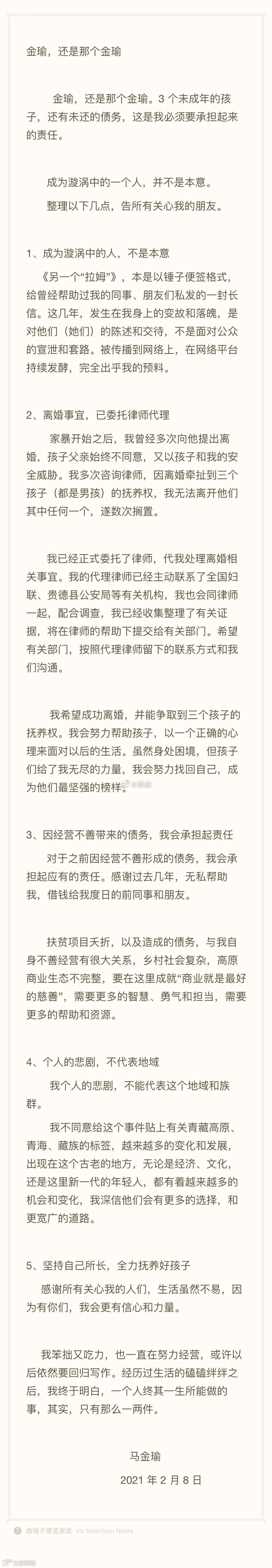 2月8日晚间,马金瑜在最新的微博中以《金瑜还是那个金瑜》为题对外界的关注和质疑进行回应称,成为旋涡中的人并非本意,《另一个“拉姆”》本是给曾经帮助过的同事、朋友私下发的一封长信,想告诉他们几年来发生在其身上的变故和落魄,不是面对公众的宣泄和套路。