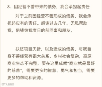 今日晚间,马金瑜对债务一事也作出了回应。她表示,因经营不善带来的债务会承担责任,债务和自身能力关系很大,也和乡村社会复杂、高原商业生态不完整有关。