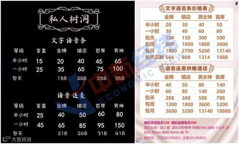 据了解,售卖虚拟恋爱产品分为文字聊天和语音连麦聊天两种,以服务方的质量区分为“金牌”“镇店”“男/女神”等,每小时价格从20-300元不等,包天价格在200-1000元之间,并提供包周、包月服务。某商家提供的报价单中,“首席”档位的连麦通话包月价格为18888元。