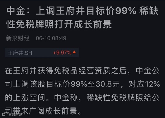 6月9日晚,王府井发布公告称,公司控股股东北京首都旅游集团有限责任公司授予其免税品经营资质,允许其经营免税品零售业务。
