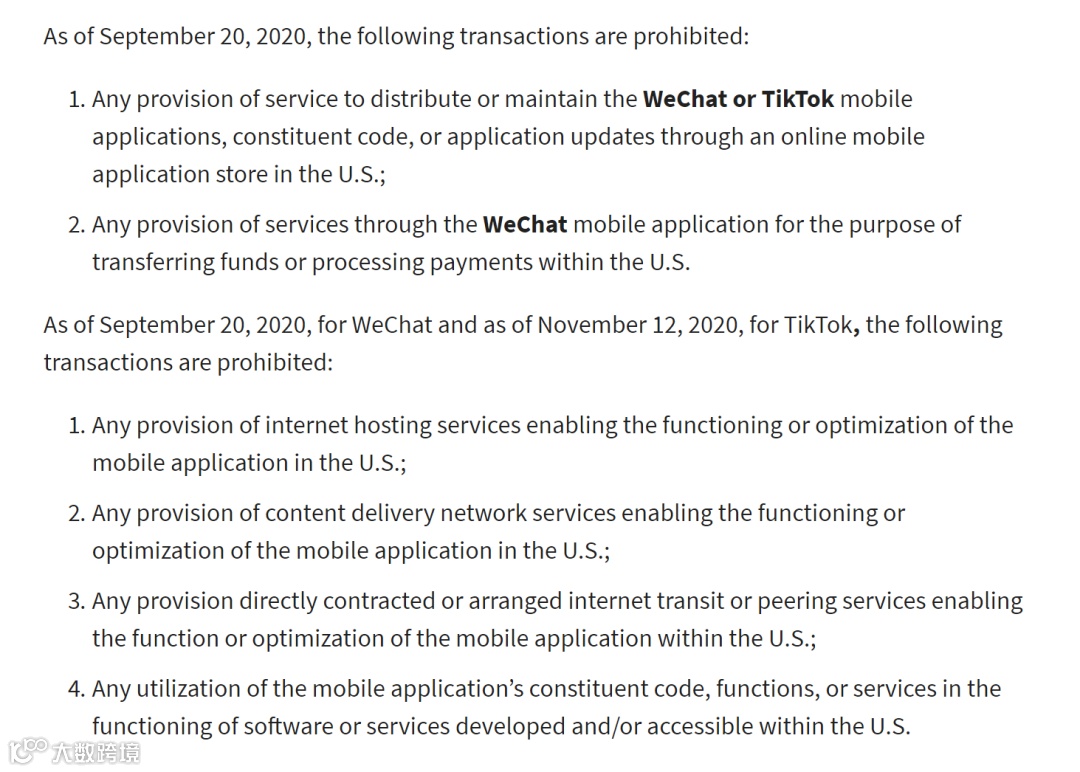 美国商务部在声明中同时表示,对于微信(2020年9月20日开始),以及TikTok(2020年11月12日开始),还将禁止以下交易:互联网托管服务、内容交付网络服务、直连/互联网中转/互联服务,以及在美国境内开发/访问的软件或服务功能中,任何利用上述移动应用程序的代码构成、功能或服务。