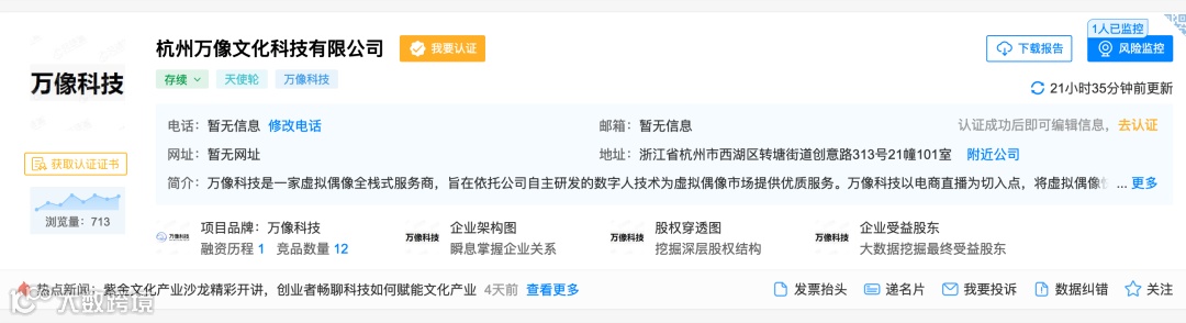 2020年,杭州万像文化科技有限公司成立,该公司同样是一家虚拟偶像服务商,旨在依托公司自主研发的数字人技术为虚拟偶像市场提供服务。