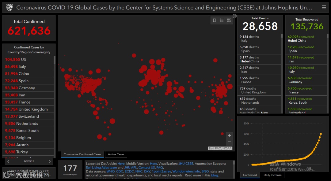 据美国约翰斯·霍普金斯大学疫情实时监测系统统计显示,截至3月28日晚11点半,全球有621636人确诊新冠病毒,28658人死亡。