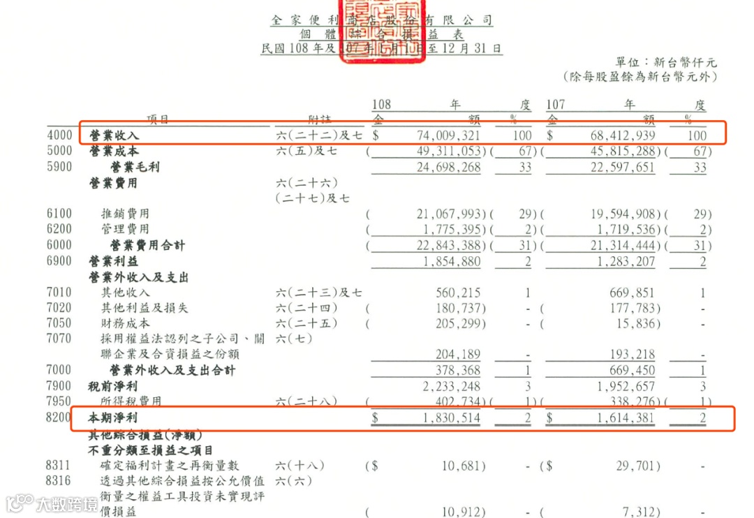 2002年全家便利店在中国台湾上市。据2019年财报显示,公司全年营收740.09亿新台币(约合人民币176亿),去年同期为684.13亿新台币。净利润为18.3亿新台币(约合人民币4.36亿),去年同期为16.14亿新台币。
