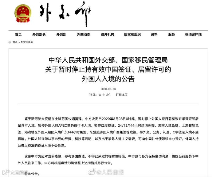 导读:3月26日,中华人民共和国外交部、国家移民管理局发布关于暂时停止持有效中国签证、居留许可的外国人入境的公告。