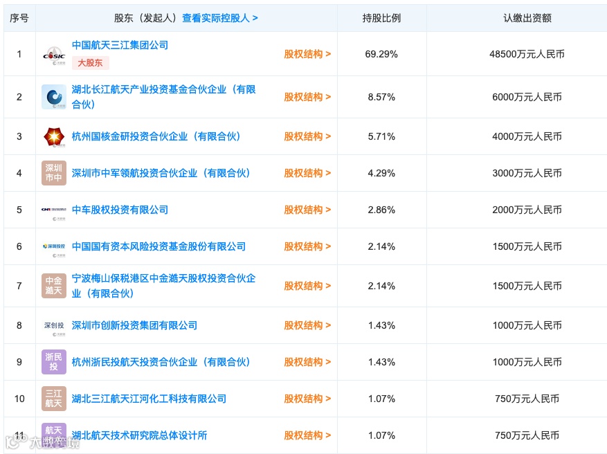 公司成立于2016年,注册资本7亿人民币,法人为张镝。股权方面,中国航天三江集团公司持有航天科工火箭69.29%的股份,而航天三江集团为中国航天科工集团有限公司的全资子公司,由此来看,航天科工火箭技术有限公司拥有强大的国资背景。