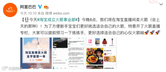 到了昨日愚人节,阿里巴巴官方微博发布,淘宝宣布成立火箭事业部,推出了火箭选购指南,并邀请快舟火箭首席科学家助理曹梦为大家介绍如何购买一款合适的火箭。曹梦称,买火箭要明确预算以及购买用途,并了解火箭分类。快舟一号甲运载火箭对发射场地要求低,准备周期短,可以快速响应客户需求。