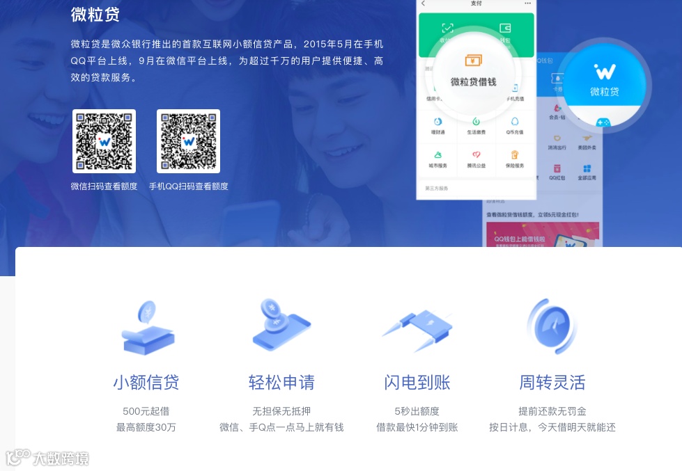 公开资料显示,微粒贷是一款依托于微信、QQ的信贷产品,目标用户是传统信贷难以覆盖的工薪阶层、自由职业者以及微小、双创企业。不同用户享有不同的授信额度(500元~30万元)及在0.02~0.05%之间的日利率。