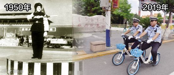 (左图为:1950年,长安街上的交警在指挥交通;右图为:2019年,呼和浩特交警使用哈啰智巡,用科技管理城市)