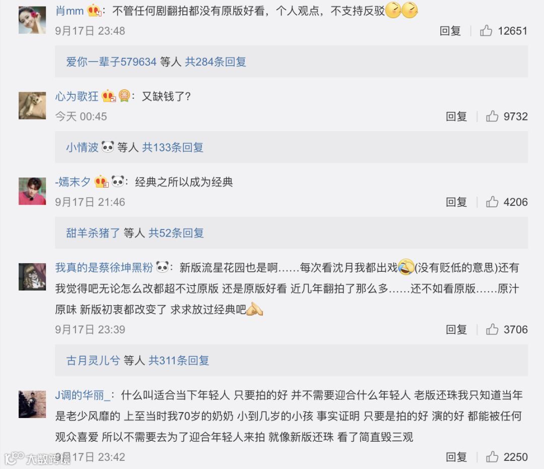 一位影视圈的业内人士对蓝鲸表示,好的剧本可遇不可求,对于影视公司而言,翻拍经典比打造经典影片要更加容易。经典IP自带的影响力,无论翻拍好坏与否,电视剧势必会引起广大网友的关注。毋庸置疑的是,翻拍的作品往往难以超越经典,甚至会引发原著粉丝的不满,但就关注度上来讲,翻拍经典IP比起新的剧本已经赢在了起跑线上。