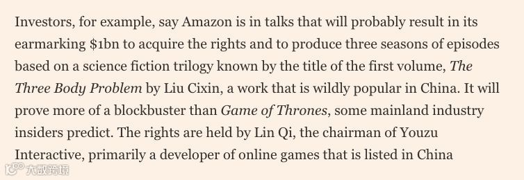 原标题叫 China’s Hollywood dreams still beguile investors,而不是大家看到的科技论坛转载的那个 Amazon in talks to produce Three Body Problems series for $1 billon.