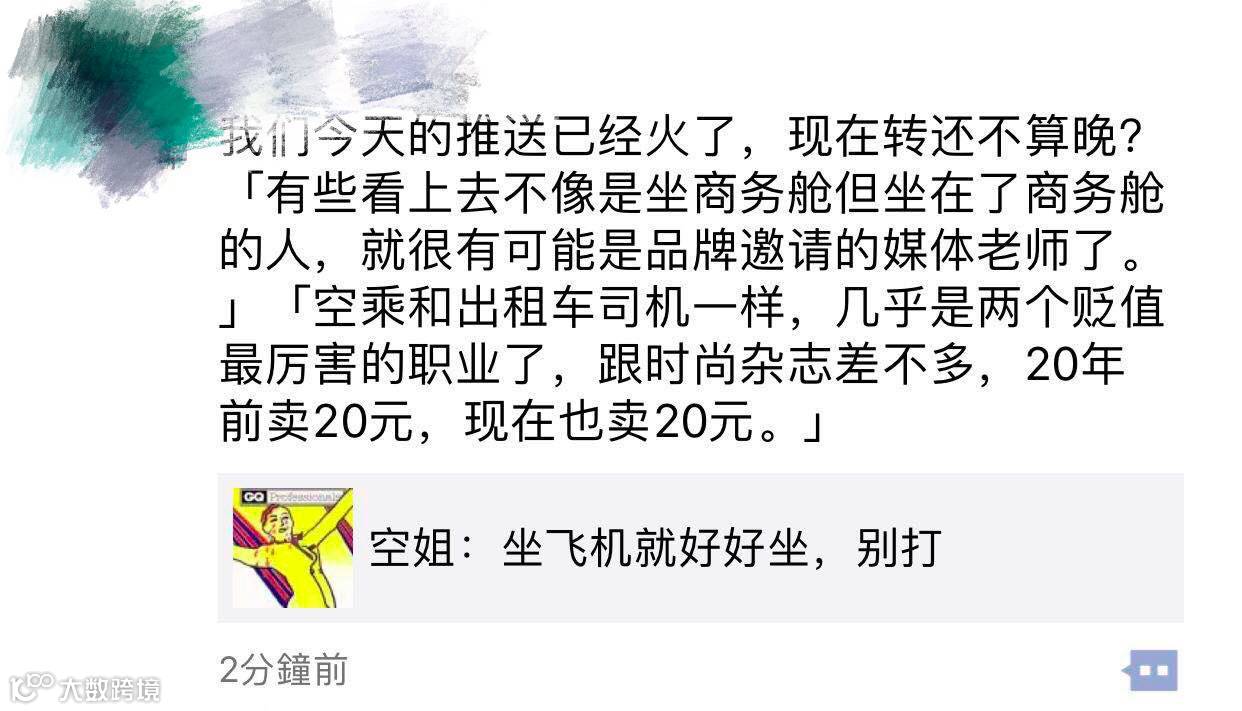 不可否认,“不该出现在商务舱的媒体老师”一言戳中了痛点,也是媒体人最关心的话题,但GQ的这篇文章会火,更大程度上是“空姐文”对读者的吸引力。